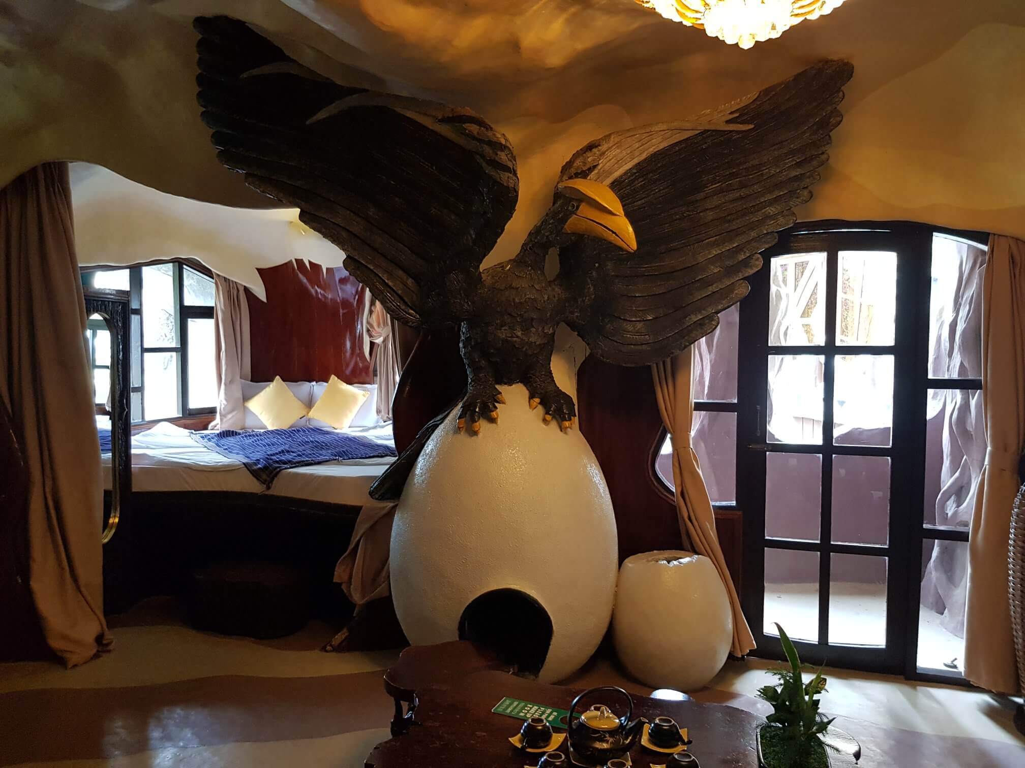 An undeniable highlight includes the uniquely designed accommodations and tea rooms,shaped like pumpkins,bears,or kangaroos. The bold color combinations within the interior,initially seeming incompatible,merge to form an overall eerie and mesmerizing picture,akin to a mysterious labyrinth.