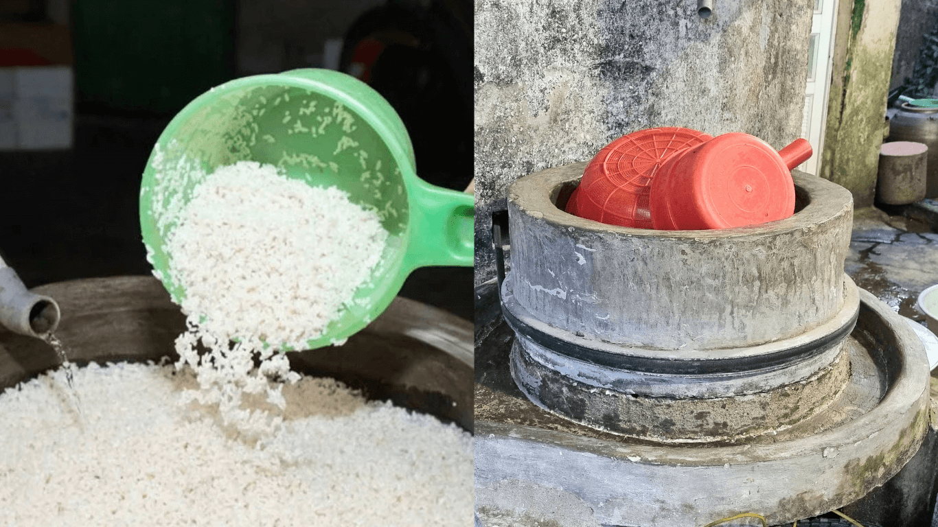 Bánh đa của bác Goòng được làm từ loại gạo Q5 – loại gạo không dẻo,phù hợp để làm bánh giòn. Gạo được ngâm kỹ từ 6 đến 7 tiếng để nở đều,sau đó đem xay thành bột nước mịn. Bột sau khi xay không để quá lâu nhằm giữ được vị tươi,không chua. Mỗi lớp bột tráng ra phải đều tay,mỏng và tròn để khi phơi lên mới giòn đều khi nướng.