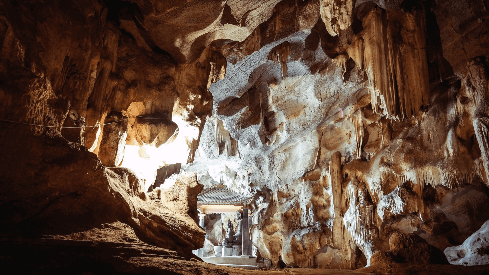 Dark Cave is a fairly long space,with electricity inside so visitors can easily explore the cave. Inside is an extremely massive,majestic natural structure under the yellow electric light. You will see images of young boys,fairies,dragons,etc. carved in stone in great detail and meticulously. All are displayed right before everyone's eyes like a petrified fairy world. Near the cave entrance on the pahri side,there are 3 majestic stone Buddha statues symbolizing eternal existence. In the middle is Amitabha Buddha,on the left is a stone statue of Lao Tho and Quan Am Thi Kinh,on the right is Van Thu Bodhisattva.