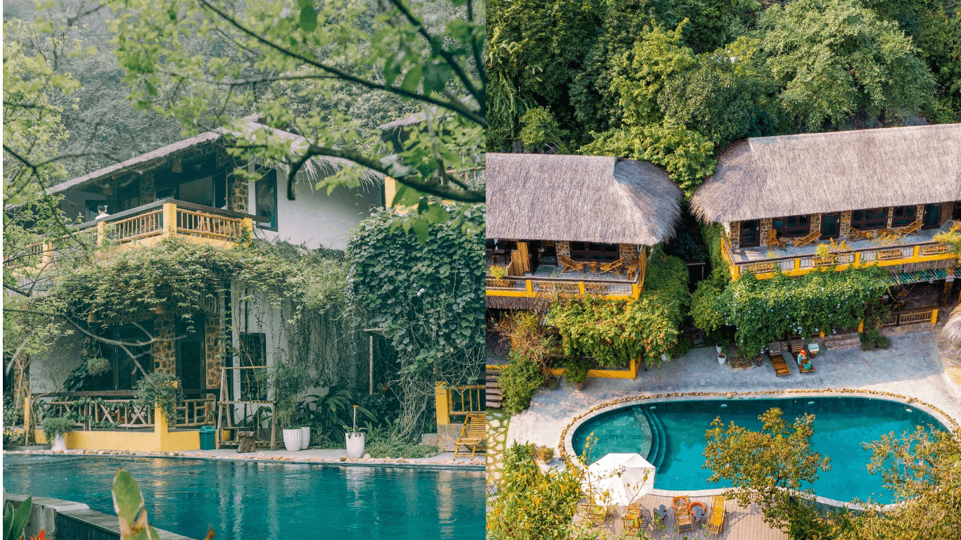 Vẻ đẹp hoang sơ của nơi này quyện với sự tinh tế trong cách bố trí khuôn viên,tạo ấn tượng khó quên. Khuôn viên rộng lớn,bao quanh bởi dãy núi đá vôi sừng sững và hồ nước trong xanh. Dăm ba con đường mòn uốn lượn giữa thảm cỏ,dẫn lối du khách đến những góc check-in thơ mộng. Đây chính là điểm dừng chân lý tưởng cho những ai tìm kiếm sự yên bình và tách biệt khỏi đô thị ồn ào.