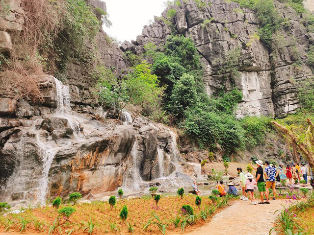 Ngay cạnh khu vườn,thác nước dưới chân Hang Múa là điểm đến khiến tớ cảm thấy thư thái từng giây phút. Âm thanh của dòng nước chảy róc rách tạo nên bản nhạc thiên nhiên dịu dàng,sưởi ấm tâm hồn mỗi du khách khi đến đây. Mỗi tia nước đổ xuống tạo thành những tia sương mỏng,khiến cho không gian trở nên mát mẻ và đầy huyền ảo. Khung cảnh ấy mở ra một bức tranh thiên nhiên sống động,thu hút mọi ánh nhìn của khách tham quan.