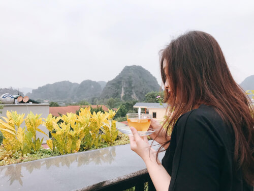 Không gian quán mở rộng lên sân thượng, hướng nhìn ôm trọn vùng non nước Ninh Bình. Buổi chiều, khi ánh nắng dịu xuống, tớ thường ngồi ở tầng trên ngắm hoàng hôn đỏ rực trên cánh đồng. Mặt trời lặn sau dãy núi đá vôi tạo nên khung cảnh rất nên thơ và lãng mạn. Mỗi lần ghé đây, tớ đều tranh thủ lưu lại vài tấm hình vì cảnh lúc nào cũng đẹp mê hồn.