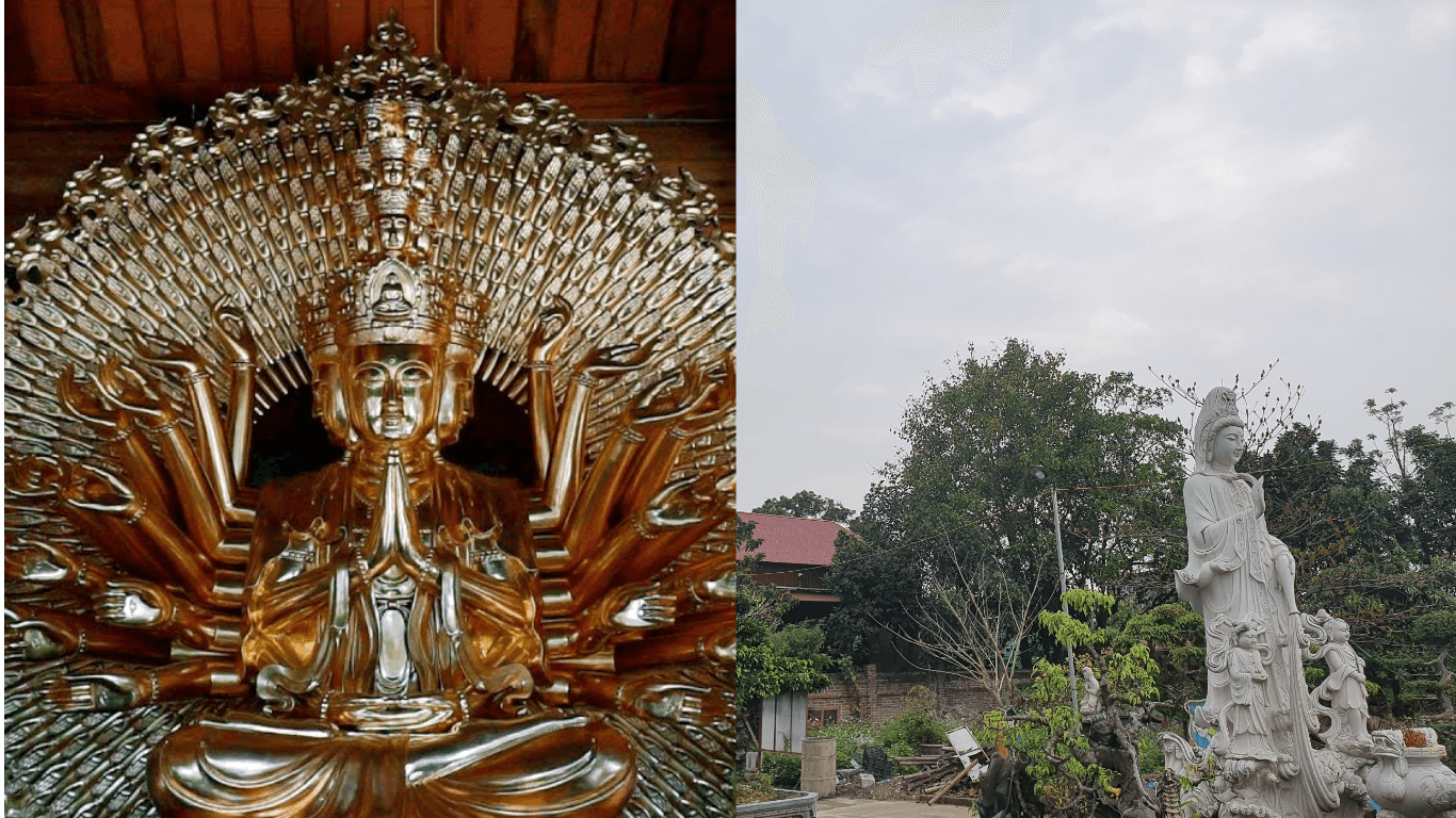 Trước tiền đường,hai tượng Hộ pháp lớn ngồi trên con sấu cao hơn ba mét tạo nên vẻ trang nghiêm và mạnh mẽ. Bên phải là tượng Đức Ông,bên trái là tượng Đức Thánh Hiền,cả hai đều thể hiện sự uy nghi của những vị thần bảo hộ chùa. Kết nối với tiền đường là trung đường,nơi dẫn dắt du khách vào phần hậu cung của chùa. Qua trung đường,không gian tiếp tục mở rộng với ba gian hậu cung,trong đó gian giữa rộng lớn hơn hai gian hai bên.