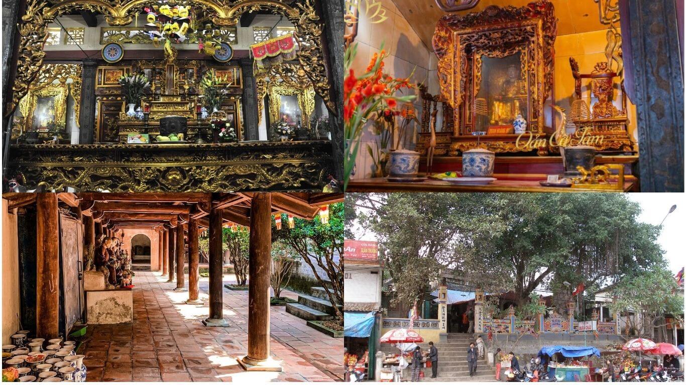 Khi bước vào bên trong đền,du khách sẽ bắt gặp kiến trúc hình chữ nhị đặc trưng. Trên các cột và hiên đền,những họa tiết rồng và hoa cúc được chạm khắc tinh xảo,phản ánh nghệ thuật điêu luyện của vùng Bắc Bộ. Mái đền uốn lượn như hình rồng,tạo nên sự uy nghiêm và tráng lệ cho toàn bộ công trình. Bậc tam cấp dẫn lối vào không gian linh thiêng,nơi du khách có thể chiêm ngưỡng các tác phẩm điêu khắc độc đáo.
