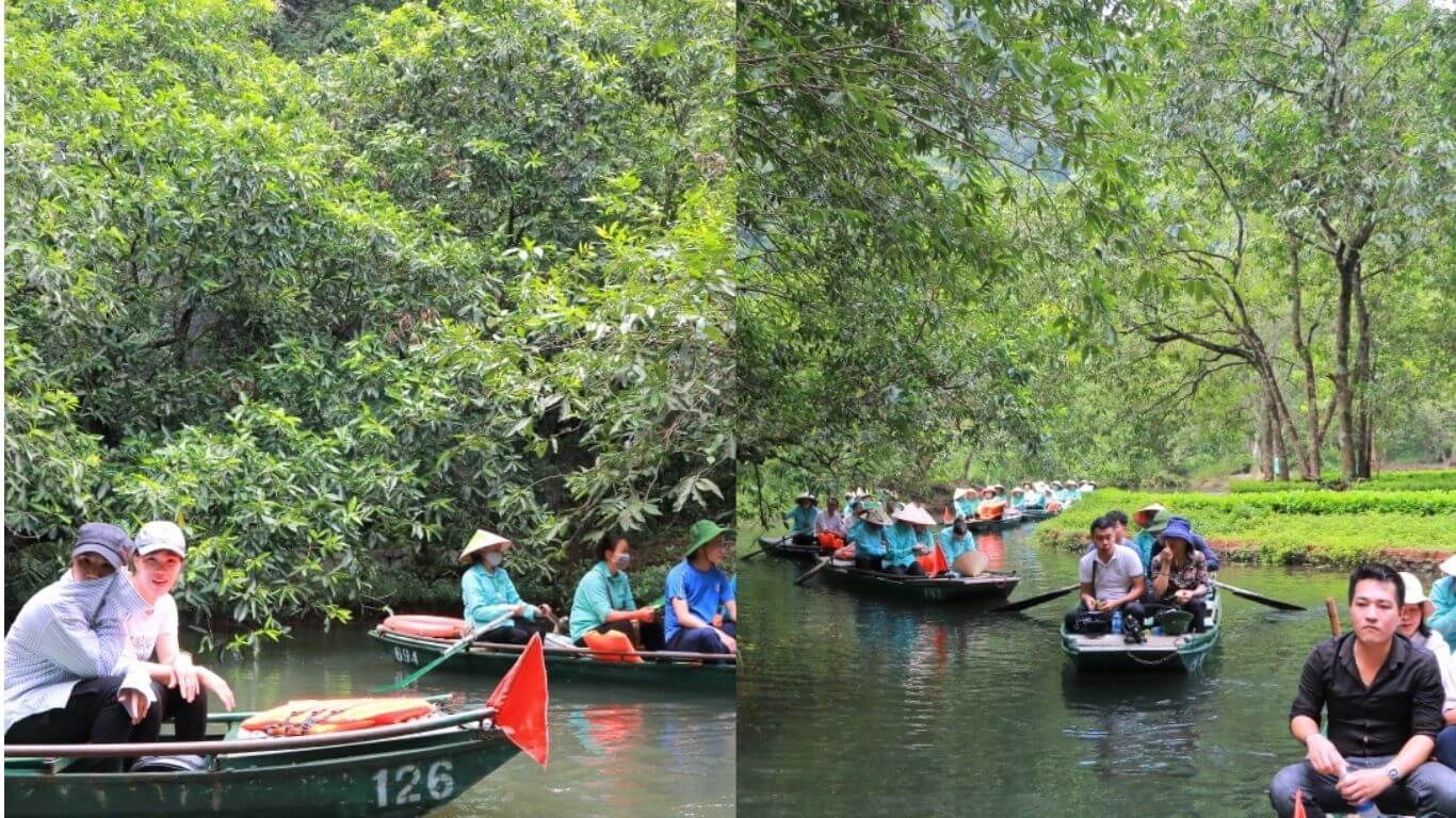 Còn nếu như bạn muốn tận hưởng một chuyến đi thư giãn giữa thiên nhiên,hãy thử ngồi thuyền trên dòng nước xanh trong của Thung Vối Tràng An. Những chiếc thuyền nhỏ sẽ đưa bạn len lỏi qua các ngọn núi đá vôi hùng vĩ,khám phá những hang động kỳ thú và chiêm ngưỡng hệ sinh thái thủy sinh đa dạng. Dòng nước ở đây trong vắt đến mức có thể nhìn thấy những đàn cá nhỏ bơi lội dưới đáy sông. Hành trình này mang lại cảm giác yên bình và mở ra cơ hội tiếp cận những góc hoang sơ khó đi bộ tới. Bạn có thể chọn thuyền truyền thống có động cơ hoặc tự chèo thuyền kayak,tùy theo sở thích và số lượng người trong nhóm.