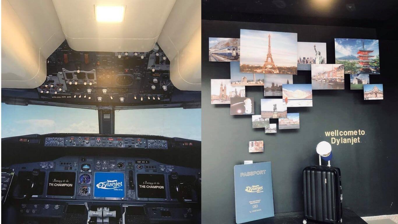 Nhân viên tại DylanJet đều mặc đồng phục giống như tiếp viên hàng không,tiếp đón khách hàng một cách chuyên nghiệp và thân thiện. Các bộ bàn ghế được bố trí hợp lý,mỗi chỗ ngồi đều có một ô cửa sổ lớn hơn so với thực tế máy bay,giúp bạn dễ dàng ngắm nhìn và thư giãn. Phần trần được thiết kế tinh tế với các hàng đèn dài,khu vực chứa hành lý và hệ thống điều hòa không khí,tất cả đều tái hiện một cách chân thực không gian trên máy bay.