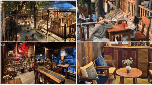 Không gian của quán làm mình ngạc nhiên ngay khi bước vào, vì nó được thiết kế rất mộc mạc mà vẫn tinh tế. Bàn ghế bằng gỗ, đệm thổ cẩm nhiều màu sắc và ánh đèn vàng dịu tạo nên bầu không khí ấm áp. Khi ngồi xuống, mình có cảm giác như đang ở một ngôi nhà sàn nhỏ giữa núi rừng, rất dễ chịu. Điều đó khiến tâm trí mình nhẹ nhõm hơn, khác hẳn sự ồn ã bên ngoài.