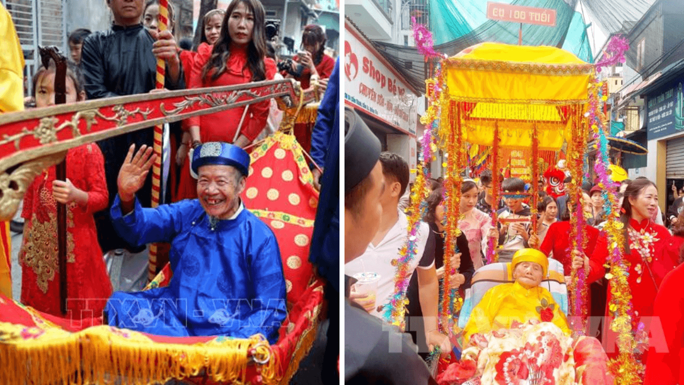 Tiếp theo,vào ngày mùng 6 tháng Giêng,những gia đình không tham gia lễ rước người thượng thọ đến miếu Tiên Công sẽ thực hiện nghi lễ đưa cụ lên miếu để lễ tổ. Đây là một nghi thức trang nghiêm,thể hiện lòng kính trọng và tôn vinh bậc trưởng lão trong gia đình. Những gia đình có điều kiện sẽ tổ chức đoàn rước long trọng,cùng nhau đi bộ tới miếu Tiên Công.