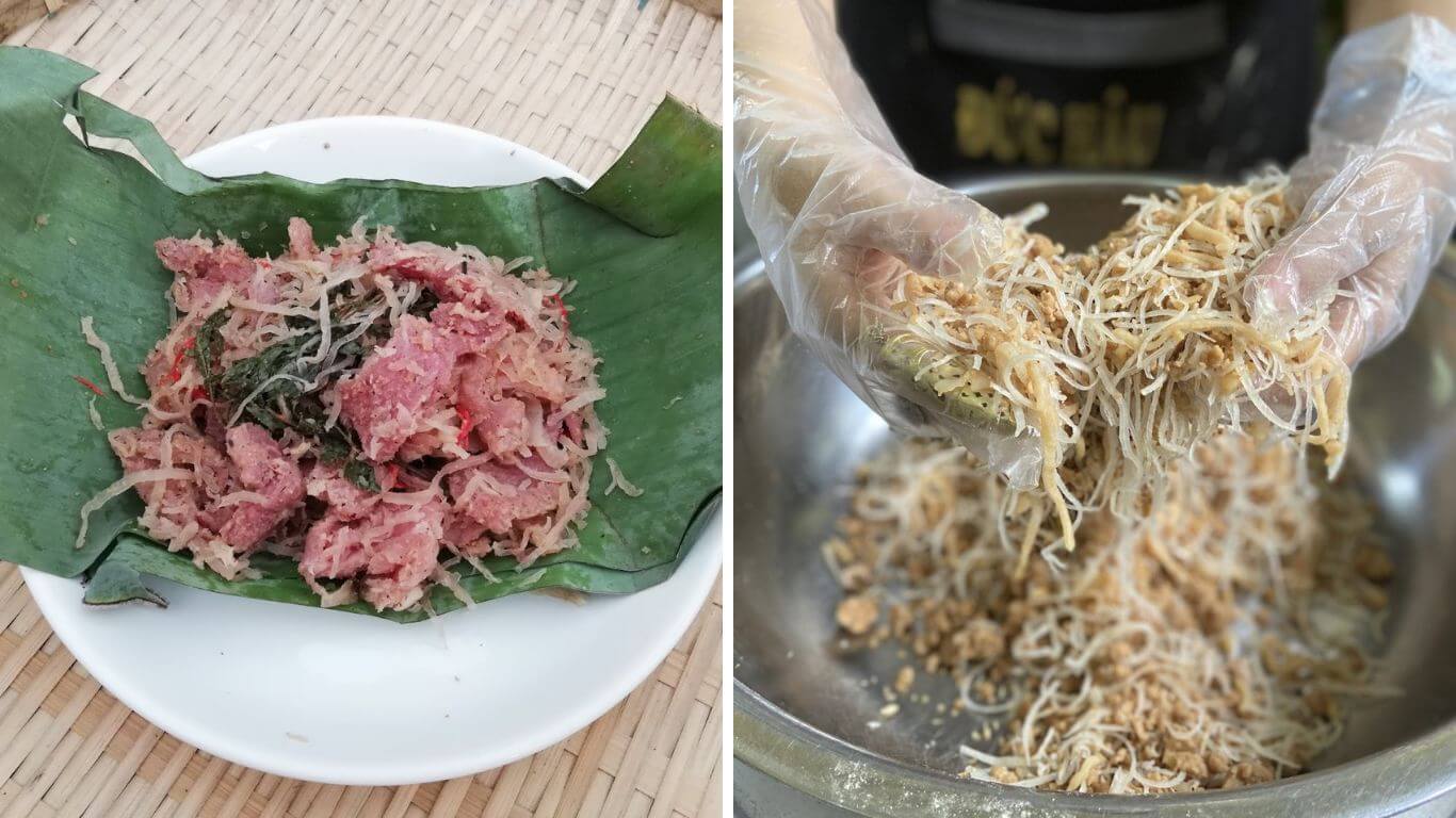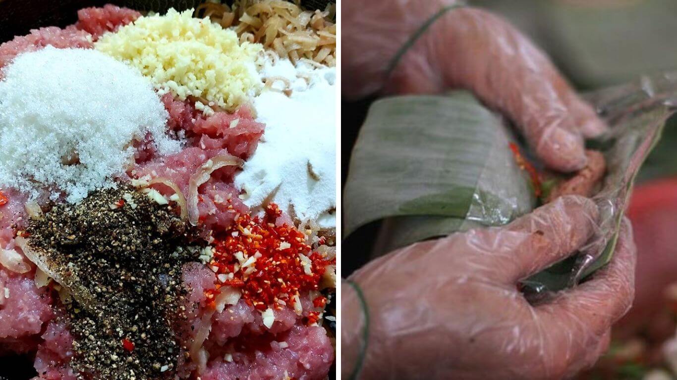 Còn đối với nem chua,quy trình chế biến đòi hỏi sự khéo léo và tỉ mỉ từ người làm. Đầu tiên,thịt lợn cần được chọn lựa kỹ càng,loại bỏ hoàn toàn gân và mỡ để đảm bảo nem không bị hỏng dễ dàng. Sau khi làm sạch,bì lợn được luộc chín và cắt thành sợi mỏng. Thịt và bì sau đó được trộn đều với muối và thính,quá trình này cần sự cân nhắc đúng lượng để đảm bảo nem lên men tốt mà không bị chua quá.