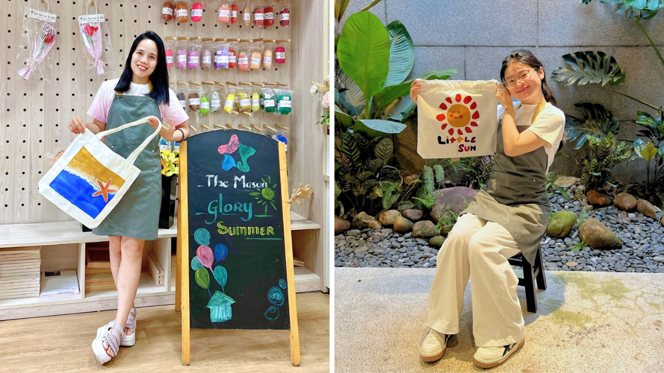Hoạt động tô vẽ túi tote được nhiều bạn yêu thích nhờ sự tự do sáng tạo. The Mason chuẩn bị sẵn túi vải trắng,màu vẽ,bút cọ với đủ kích thước. Bạn có thể tự thiết kế họa tiết,vẽ chữ hay tạo họa tiết theo gợi ý của nhân viên. Mình từng thử vẽ một bức tranh nhỏ mô phỏng cảnh Hạ Long lên túi và thấy rất thú vị.