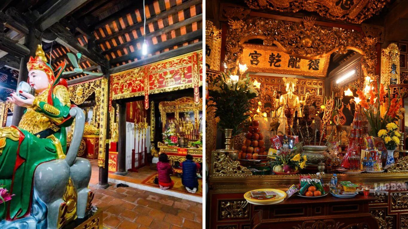 Bước vào chính điện,du khách sẽ thấy không gian thờ phụng nhiều vị Phật và các vị thần linh được sắp xếp hài hòa. Thiết kế của chính điện theo hình chữ Đinh,đối xứng hai bên,tạo nên sự cân đối và hài hòa. Ở tầng cao nhất là Di Đà Tam Tôn,dưới đó là Phật A Di Đà ngồi thiền trên đài sen,biểu tượng của sự thanh tịnh. Tiếp theo là tượng Quan Âm với ngàn mắt ngàn tay,cùng với Thiện Tài và Long Nữ đứng bên cạnh. Ngọc Hoàng Thượng Đế đứng thứ tư,thể hiện vai trò cai quản cõi trời,và cuối cùng là tượng Cửu Long,hay Thích Ca sơ sinh. Khu vực cung tả và cung bên hữu của chính điện cũng được trang bị các tượng thờ cha Thánh Trần Hưng Đạo và mẹ Vân Phương Thánh Mẫu,tạo nên một không gian linh thiêng đầy đủ và trang trọng.