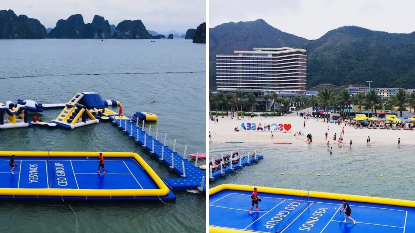 Sân pickleball nổi trên biển vừa xuất hiện tại khu nghỉ dưỡng Wyndham Garden Sonasea Vân Đồn,Quảng Ninh. Công trình được thiết kế dưới dạng phao nổi hoặc bơm hơi,cố định chắc chắn để đảm bảo an toàn cho người chơi. Vị trí sân nằm trên mặt nước của bãi Dài,hướng thẳng ra Vịnh Bái Tử Long,mang lại không gian mở,hòa trọn giữa biển trời. Đây là một trong những hạng mục mới giúp khu nghỉ dưỡng 5 sao này trở nên khác biệt trên bản đồ du lịch của tỉnh.