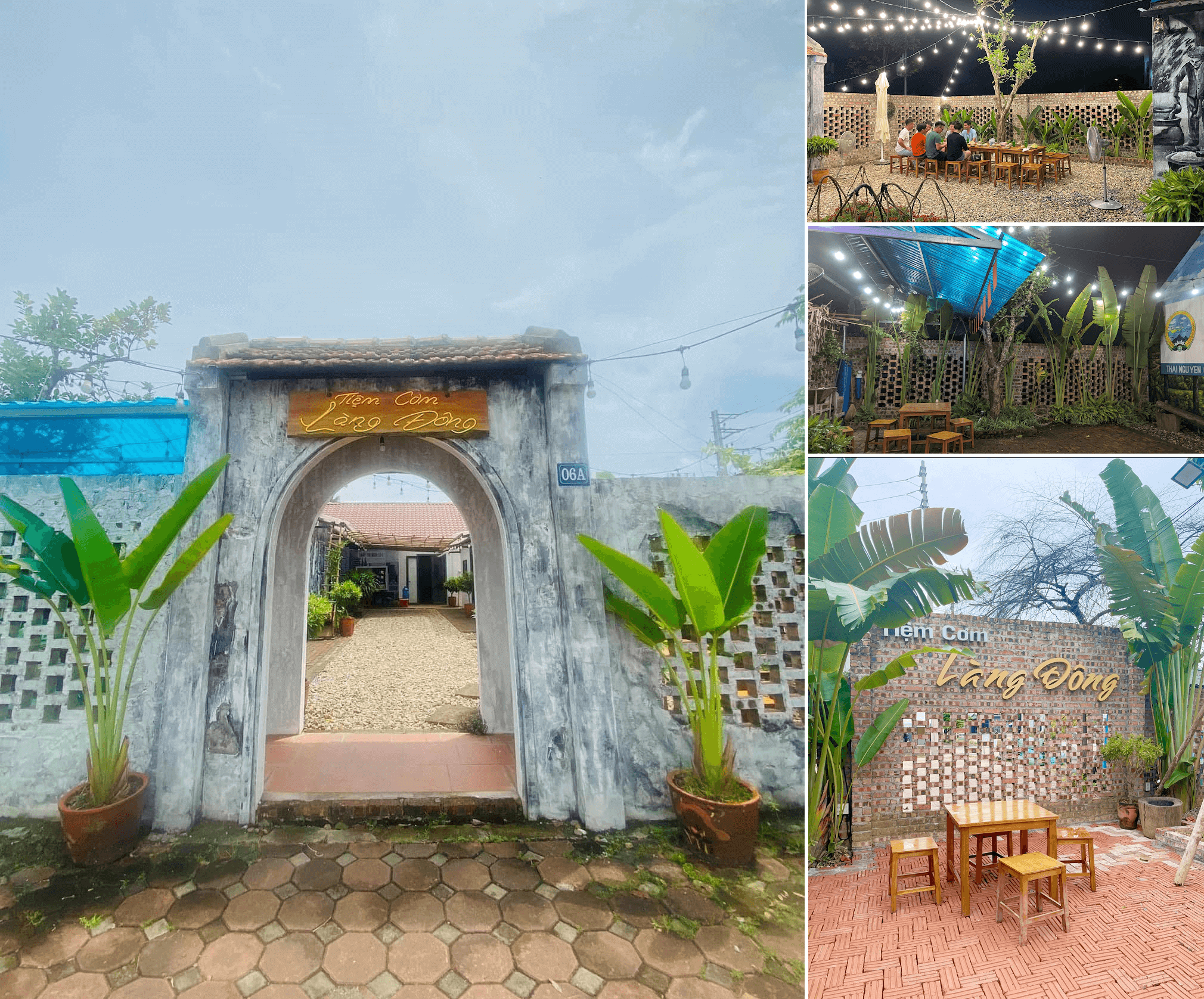 Tôi đến tiệm cơm làng Đông vào 1 ngày cuối tuần,tất nhiên là tôi đi cùng cả gia đình của mình. Đi qua cổng (vì gọi là làng nên cổng tiệm cũng khá đặc biệt,đậm chất làng quê Bắc Bộ Việt Nam) là 1 khoảng sân rộng với những hàng cây chuối lùn của núi rừng Tây Bắc. Sân là nền đất nhưng được rải 1 lớp sỏi nhỏ nên khá là sạch sẽ. Có vài bộ bàn ghế gỗ và 2 chiếc chum để cắm hoa chuối trang trí,tường thì là tường gạch tổ ong,khung cảnh khá là mộc mạc,yên bình.