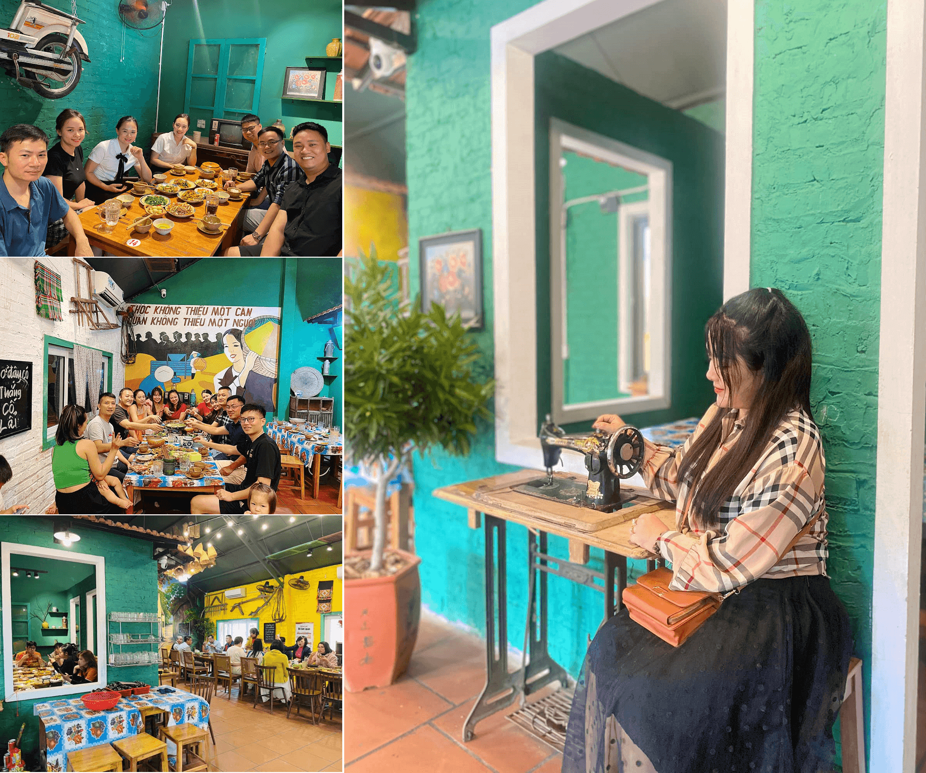 Bước vào quán,mẹ tôi thốt lên “Ồ! Cái chạn,cái máy khâu”. Không gian xưa cũ,tái hiện hoàn toàn khung cảnh của 1 thời những năm tháng đã qua khi đất nước còn chưa đổi mới. Bàn ghế gỗ cũ kỹ cùng với chiếc tivi đen trắng,chiếc đài cát sét,bộ ấm chén và những chiếc bát với lớp men hơi ngà ngà mà không được trắng tinh như bây giờ… những câu khẩu hiệu như “Thóc không thiếu một cân,quân không thiếu một người” treo đầy trên tường và những bức tranh tường cũng thể hiện tinh thần tất cả hướng tới tương lai tốt đẹp. Những khung cửa sổ cũ kĩ nhưng lại là background tuyệt vời để bạn check in,tất cả đều gợi lại trong tâm trí mỗi người về 1 thời đã qua với biết bao kỉ niệm xưa cũ.