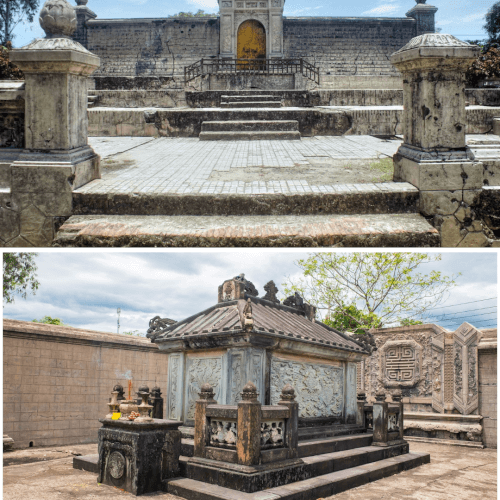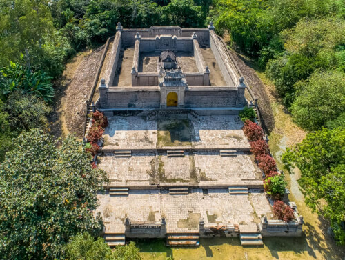Lối đi dẫn vào lăng rợp bóng cây,dễ tạo cảm giác thư giãn và nhẹ nhàng. Hai bên là hàng cau và những bụi tre gợi nhắc khung cảnh làng quê xưa. Mỗi bước chân qua đều mang lại sự kết nối đặc biệt với lịch sử. Không gian nơi đây giúp tâm trí chậm lại,cảm nhận rõ hơn từng hơi thở của Huế.