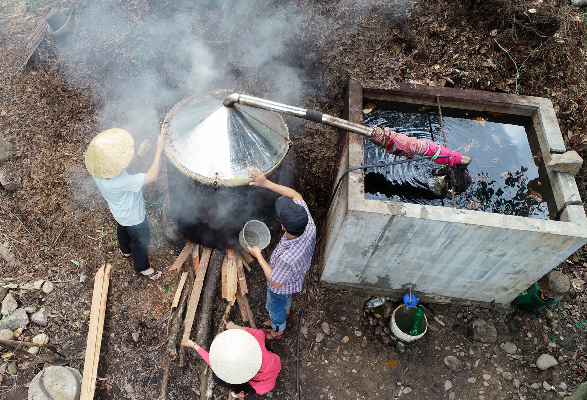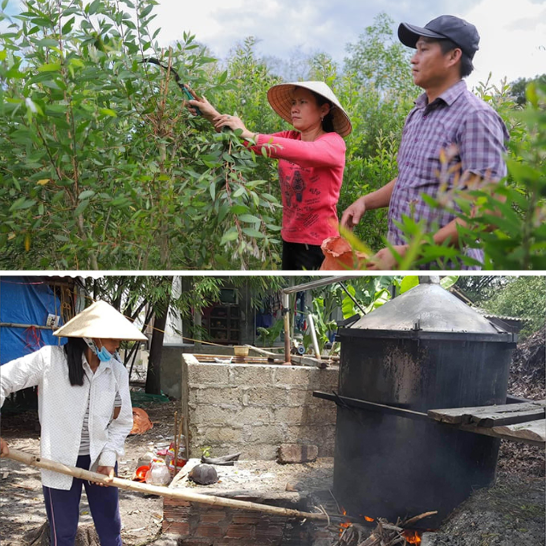 Để có được một mẻ dầu chất lượng, người thợ phải tỉ mỉ ngay từ khâu chọn lá tràm. Lá dùng để nấu cần đạt độ già vừa phải, xanh tươi và thơm tự nhiên. Người làng thường đi hái vào buổi sáng sớm, khi sương còn vương trên tán lá để giữ trọn hương tinh dầu. Nhìn họ gánh từng bó lá nặng trĩu, mình cảm nhận được tình yêu họ dành cho công việc giản dị này.