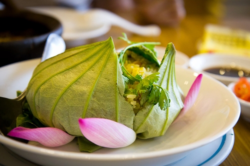 Cách trình bày của món cơm sen cung đình toát lên vẻ tao nhã. Lá sen được gói khéo léo,vài cánh hoa đặt viền ngoài như một bông sen vừa hé. Mở gói cơm,hương sen thanh thoát tỏa ra,hòa quyện với mùi tôm,thịt và gạo thơm. Tất cả gợi nên cảm giác bình yên và gần gũi.