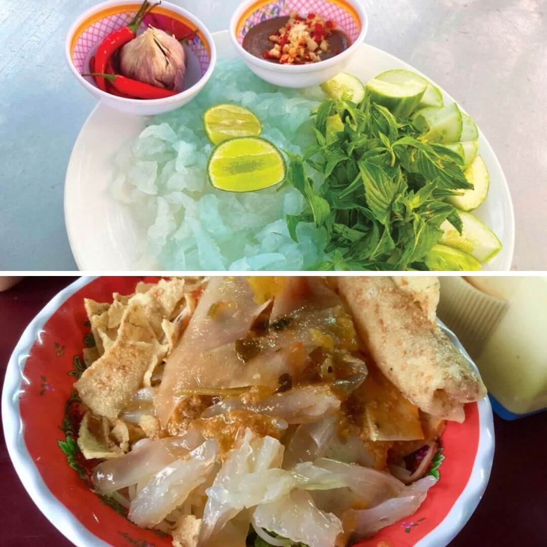 Một sự kết hợp hoàn hảo khác đó chính là bún giấm nuốc. Thưởng thức bún giấm nuốc Huế tại một quán nhỏ truyền thống bên bờ sông Hương thật sự là một trải nghiệm đáng nhớ. Chân nuốc được ngâm trong nước lạnh cùng lá ổi đã vò,giữ cho chúng luôn giòn và tươi ngon. Khi phục vụ,nhân viên quán tỉ mỉ vớt nuốc ra và vắt khô thật kỹ,đảm bảo khi trộn với bún,hương vị sẽ đậm đà hơn. Nước dùng được nấu từ tôm tươi nguyên con,xào cùng hành và ớt bột,tạo nên mùi thơm hấp dẫn mà khó có thể quên được.