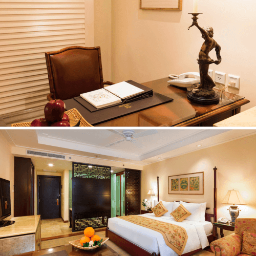 Phòng ở Indochine Palace rất rộng,cửa sổ lớn mở ra view nhìn thành phố hoặc hồ bơi. Khi bước vào,mùi hương nhẹ nhàng và không khí trong lành khiến mình thấy thư thái ngay. Giường ngủ êm ái,chăn ga được thay mới sạch sẽ khiến mình dễ chìm vào giấc ngủ sâu. Phòng tắm hiện đại,có cả bồn tắm và vòi sen,rất tiện cho nhu cầu thư giãn khác nhau.