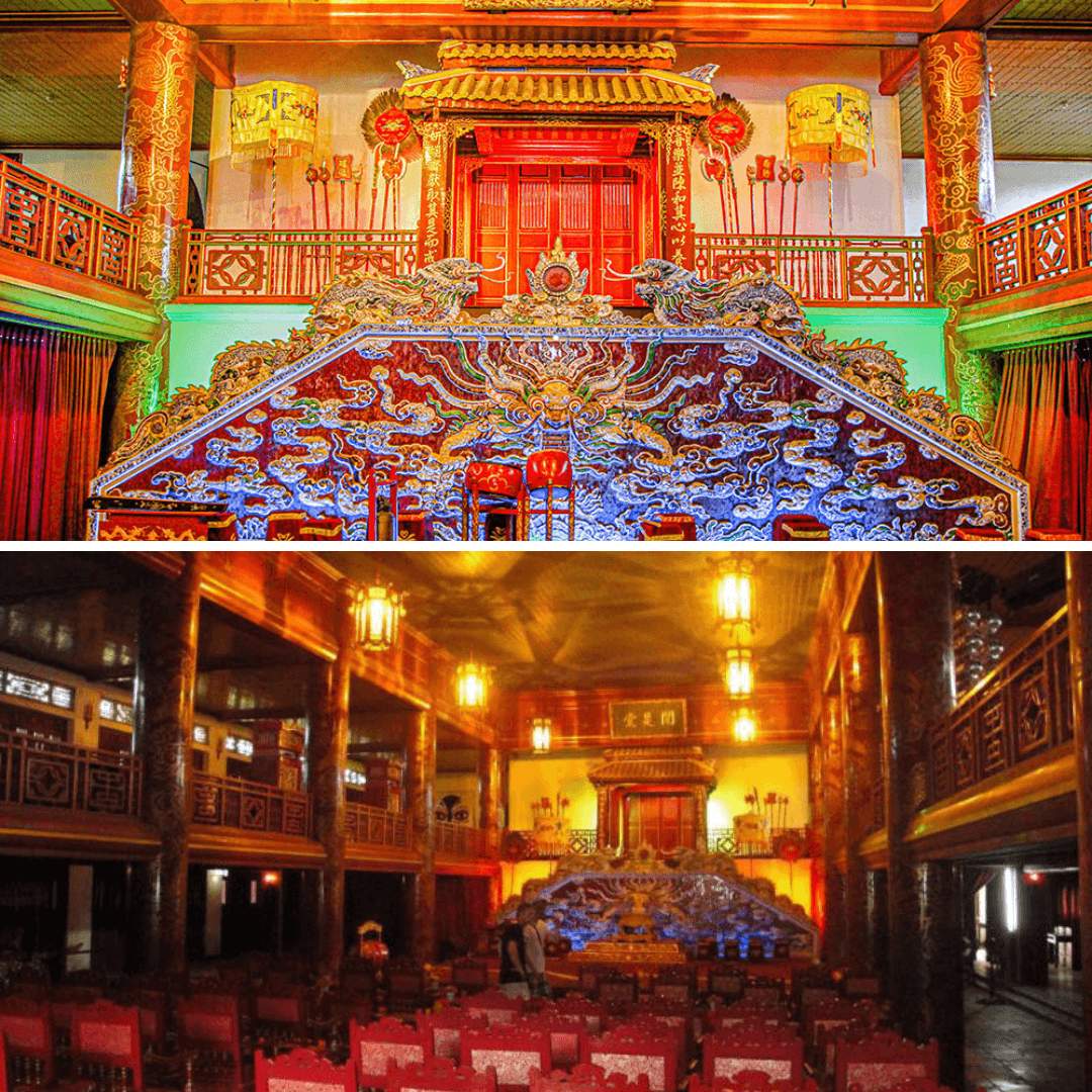 Đại Nội Huế là một phần trong Quần thể di tích Cố đô Huế, mang đậm dấu ấn văn hóa, lịch sử, kiến trúc của triều đại nhà Nguyễn, tổ chức UNESCO đã công nhận là di sản văn hóa thế giới vào năm 1993. Nằm ở bên bờ dòng sông Hương, Đại Nội Huế là một trong số các di tích thuộc cụm Quần thể di tích Cố đô Huế được công nhận là Di sản Văn hoá Thế giới và còn lưu giữ nhiều dấu ấn đặc sắc của nét phong kiến triều đình nhà Nguyễn hàng trăm năm trước. Đại Nội Huế là cụm di tích bao gồm Hoàng Thành (nơi vua thiết triều và làm việc) và Tử Cấm Thành (nơi sinh hoạt của vua và hoàng tộc). Là một công trình có quy mô đồ sộ nhất trong lịch sử Việt Nam, Di tích Đại Nội Huế có quá trình xây dựng kéo dài tới 30 năm với hàng vạn người thi công cùng hàng loạt các công việc như lấp sông, đào hào, đắp thành, dời mộ… cùng khối lượng đất đá khổng lồ lên đến hàng triệu mét khối. Đến thăm quan quần thể di tích Đại Nội Huế, bạn sẽ được chiêm ngưỡng hàng trăm công trình cung điện nguy nga, đền đài và miếu thờ bề thế. Với vẻ đẹp tráng lệ và kiến trúc cung điện đắc sắc, bạn chắc chắn sẽ cảm thấy thích thú trên hành trình thăm quan Đại Nội. Hoàng Thành Huế bao gồm nhiều khu vực như khu vực phòng vệ, khu vực cử hành đại lễ, khu vực miếu thờ,… được đặt giữa một không gian thiên nhiên đẹp hài hoà của những hồ nước, vườn hoa, cầu đá, hòn đảo và cây cối xanh tươi toả bóng mát. Hoàng thành có 4 cổng được đặt ở 4 mặt, trong đó cổng chính lớn nhất và có kiến trúc đẹp nhất là cổng Ngọ Môn. Cổng Ngọ Môn nhìn về phía Nam kinh thành và trông xa ra dòng sông Hương thơ mộng. Cổng Ngọ Môn có 5 cửa, trong đó cửa chính ở giữa từng là cổng dành cho vua đi, hai cổng bên dành cho quan văn, quan võ, và hai cổng bên quanh là dành cho binh lính cùng voi ngựa theo hầu. Được xây phía trên cổng là Lầu Ngũ Phụng có kết cấu bằng gỗ lim, chia làm 2 tầng và 9 bộ mái, mái giữa được lợp màu vàng, còn lại là 8 lợp mái xanh. Trước đây, Lầu Ngũ Phụng là nơi tổ chức một số các lễ lớn của triều đình nhà Nguyễn. Trải qua gần 2 thế kỷ và chứng kiến bao mốc sự kiện lịch sử quan trọng của dân tộc, Cổng Ngọ Môn vẫn tồn tại theo thời gian và đã trở thành một kiệt tác kiến trúc cổ xuất sắc! Điện Thái Hòa là một biểu trưng quyền lực của Hoàng triều nhà Nguyễn. Nằm trong khu vực Hoàng thành, Điện Thái Hoà cùng Sân Đại Triều Nghi từng là nơi diễn ra các buổi thiết triều quan trọng của triều đình. Trong nhiều cung điện trong Hoàng thành Huế, Cung Diên Thọ là hệ thống kiến trúc cung điện quy mô nhất ở Huế còn lại cho đến ngày nay. Nơi đây từng là nơi ở của các Hoàng Thái Hậu và các Thái Hoàng Thái Hậu. Cũng thuộc quần thể di tích cố đố Huế và nằm trong khu vực Hoành thành, Tử Cấm thành là nơi sinh hoạt của vua cũng như là hoàng triều nhà Nguyễn. Trong Tử Cấm Thành, có hơn 50 công trình kiến trúc với quy mô đa dạng khác nhau, tiêu biểu phải kể đến Điện Cần Chánh (nơi vua thiết triều và tổ chức yến tiệc), Điện Càn Thành (nơi vua ngủ nghỉ), Thái Bình Lâu (nơi vua thư giãn, đọc sách), Tả Vu & Hữu Vu,… Đến thăm quan Đại Nội Huế, bạn còn có thể tham gia đêm Hoàng cung được tổ chức định kỳ vào thứ Bảy hàng tuần. Trong đêm Hoàng cung ngập tràn ánh sáng, các nghi thức của cung đình xưa sẽ được tái hiện lại đầy chân thực và các hoạt động văn hóa nghệ thuật độc đáo cũng được diễn ra. Đây sẽ là một điểm nhấn vô cùng thú vị cho hành trình khám phá Đại Nội Huế của bạn! Đặc biệt hơn nữa, mới đây Đại Nội Huế đã chính thức mở cửa đón khách thăm quan vào ban đêm từ 19 – 22h và đây chính là dịp để bạn thăm quan tìm hiểu Đại Nội cũng như “sở hữu” những bức ảnh tuyệt đẹp bên những công trình rực rỡ, lung linh ánh đèn.