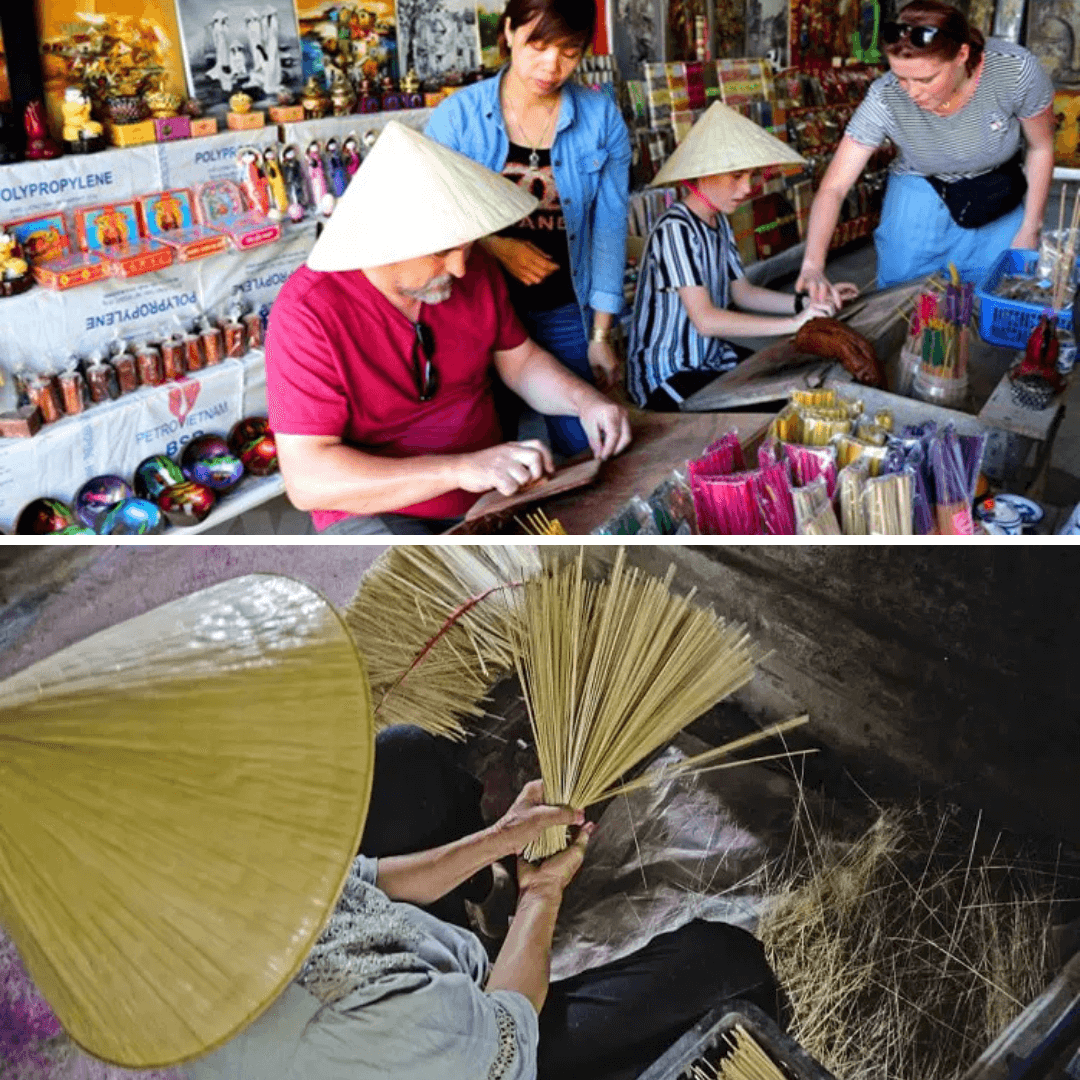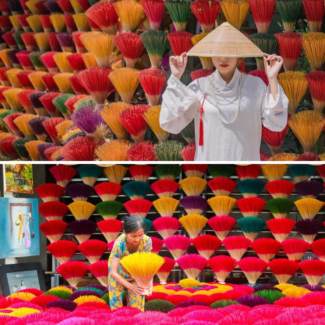 Khi đến tham quan làng,bạn sẽ được tham gia vào các công đoạn tạo nên những que hương từ khâu chọn nguyên liệu đến khi thành phẩm. Người dân trong làng sử dụng các nguyên liệu tự nhiên như ngũ vị thuốc bắc,quế,thảo quả và hoa bưởi khô để tạo nên mùi thơm đặc trưng. Quá trình này không vội vàng,mà được thực hiện một cách tỉ mỉ,với mỗi chi tiết đều mang đậm dấu ấn của người thợ lành nghề.