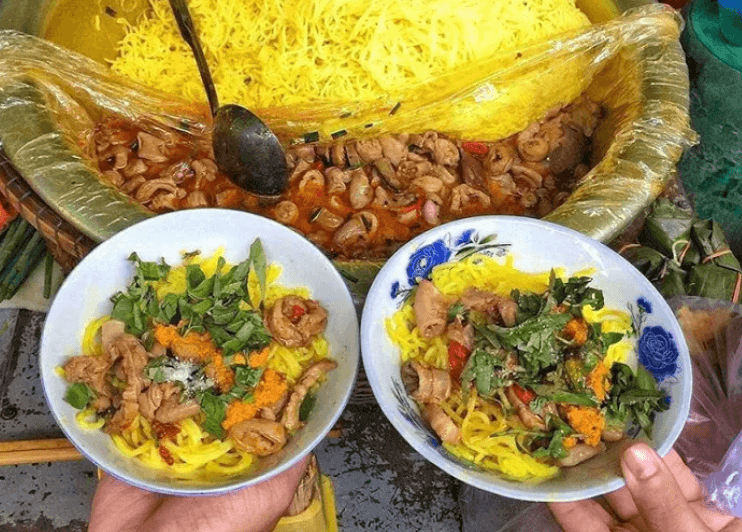 Một món ăn vô cùng đẹp mắt và đầy màu sắc đó chính là bún nghệ. Mang tên bún nghệ bởi nguyên liệu làm nên cái màu vàng bắt mắt của món ăn là từ củ nghệ. Người Huế trong cung cách ăn uống lúc nào cũng mỗi thứ 1 ít nên khi chế biến món ăn cũng sẽ như vậy. Một tô bún nghệ đầy đủ sẽ bao gồm bún,lòng xào,nghệ tươi xay nhuyễn,ăn cùng chả da dai dai,chả bò hoặc chả nướng ống tre. Món ăn tưởng chừng như đơn giản những gói gém bao nhiêu tâm tình của xứ Huế.