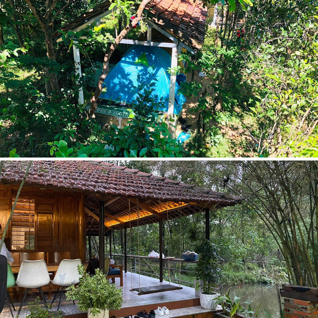 Farmstay có vài căn lều được dựng chắc chắn trên nền gỗ,có nệm,gối và màn chống muỗi đầy đủ. Mỗi chiếc lều được trang trí nhẹ nhàng bằng vài món đồ thủ công,rất gần gũi và thân thiện. Nếu bạn đi theo nhóm hoặc gia đình,có thể chọn không gian cắm trại chung rộng rãi hơn. Những ai yêu thích khám phá cũng có thể mang theo lều cá nhân và chọn chỗ dựng theo ý thích.
