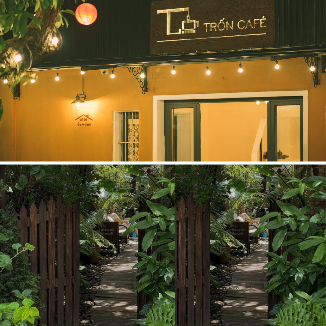 Phía ngoài là khoảng sân nhỏ với nhiều chậu cây,treo và đặt sát bức tường đá phủ rêu,nhìn rất thơ mộng. Tiếng chim kêu nhẹ vào buổi sáng và mùi cà phê thoang thoảng làm mình muốn nán lại thật lâu. Dù bạn đến một mình hay đi cùng bạn bè,nơi này luôn tạo được sự thoải mái và dễ chịu. Mỗi lần ngồi ở Trốn,mình lại có cảm giác như đang ở trong một cuốn phim nhẹ nhàng.