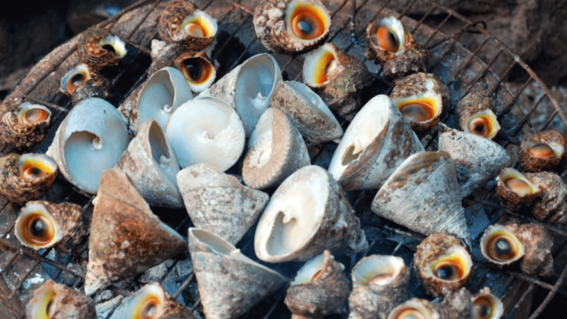 Wandering around the fishing village of Con Dao to find moon crabs,you should not miss the delicious dish of snail vu nang,a rare seafood specialty,with a tilted cone shape,a small knob on the top,a gray-black outer shell,and a mother-of-pearl sparkling inner surface. Con Dao snail vu nang is available all year round,but only appears a lot on full moon days. The snail meat is white and delicious,and can be prepared like other types of snails such as steamed,stir-fried,grilled,boiled,etc.