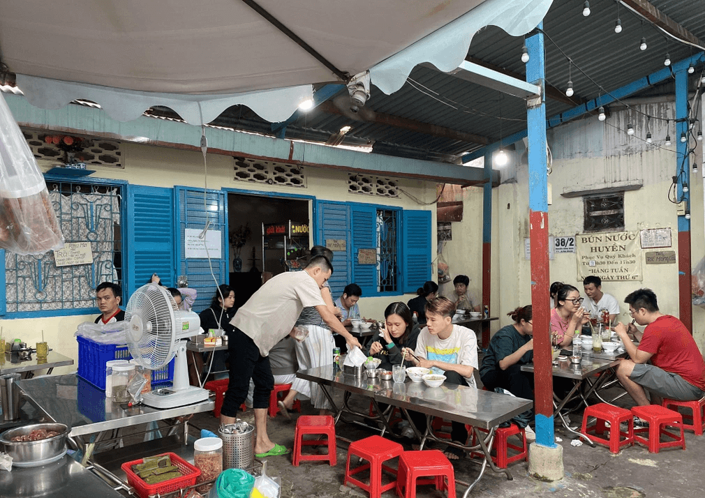 Khi vào bên trong quán bún nước cô Huyền,bạn sẽ thấy không khí quán ăn rất nhộn nhịp,bàn ghế bình dân như bao quán khác. Người ăn trong quán sẽ được chiêm ngưỡng cô Huyền vừa làm bún nước,vừa to tiếng la mắng nhân viên và tạo nên bầu không khí rất đặc biệt. Nhiều khi bạn còn gặp được những bạn làm food blogger hoặc tiktoker khi ăn trong quán của cô. Vì độ nổi tiếng của quán đã vang danh khắp Sài Gòn.