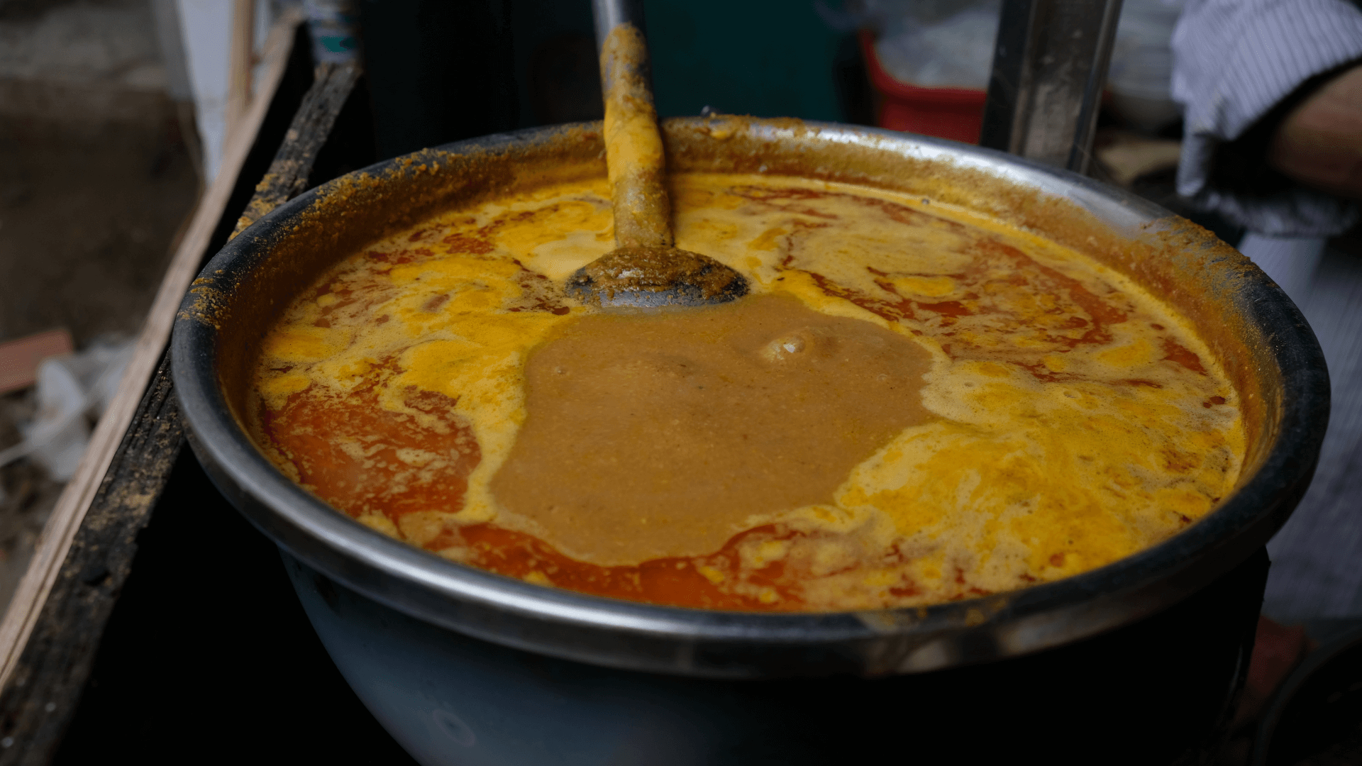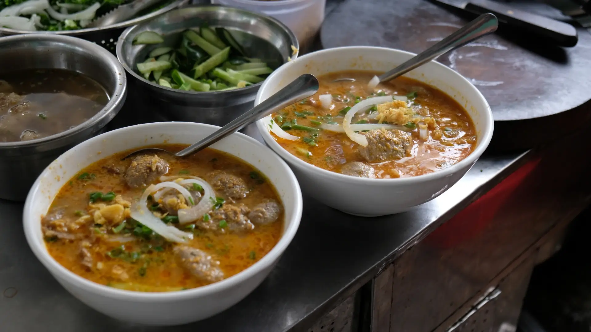 Nước lèo đậu phộng là linh hồn của món ăn,được nấu từ đậu phộng xay,ngũ vị hương,sa tế,... với nước hầm xương thị.
