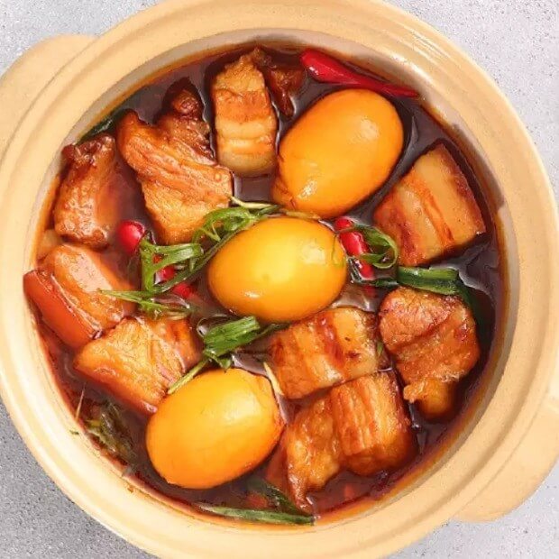 The ingredients for the dish include pork belly and eggs. The pork is cut into large square cube,the duck eggs are boiled,peeled before putting together with the pork. Spices include fish sauce,sugar,pepper,coconut water and some other spices. The dish will be braised over low heat until the pork is tender,creates an attractive,easy-to-eat,and especially delicious appearance.