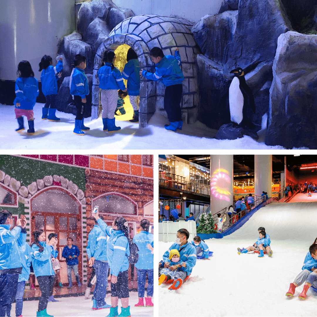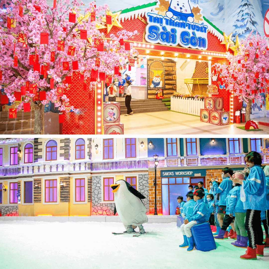Tại Snow Town Sài Gòn,cả gia đình sẽ như lạc vào câu chuyện cổ tích châu Âu,với hình ảnh những ngôi nhà gỗ phủ tuyết,ánh đèn ấm áp bên ô cửa sổ,và cây thông lung linh cạnh lò sưởi. Không chỉ ngắm nhìn,bạn còn được cảm nhận vẻ đẹp của tuyết qua các hoạt động thú vị như: từ trượt tuyết,nặn người tuyết đến chụp ảnh giữa không gian tuyết rơi,mỗi góc nhỏ của Snow Town đều mang đến cho bạn những trải nghiệm thú vị và độc đáo khó quên. Đừng quên ghi lại những khoảnh khắc đáng nhớ giữa khung cảnh lãng mạn và tràn đầy niềm vui nơi đây. Sau đó,bạn có thể ghé qua khu nhà hàng và quán cà phê để thưởng thức các món ăn nhanh và đồ uống đa dạng,hấp dẫn từ Snow Town,làm cho chuyến đi thêm trọn vẹn.