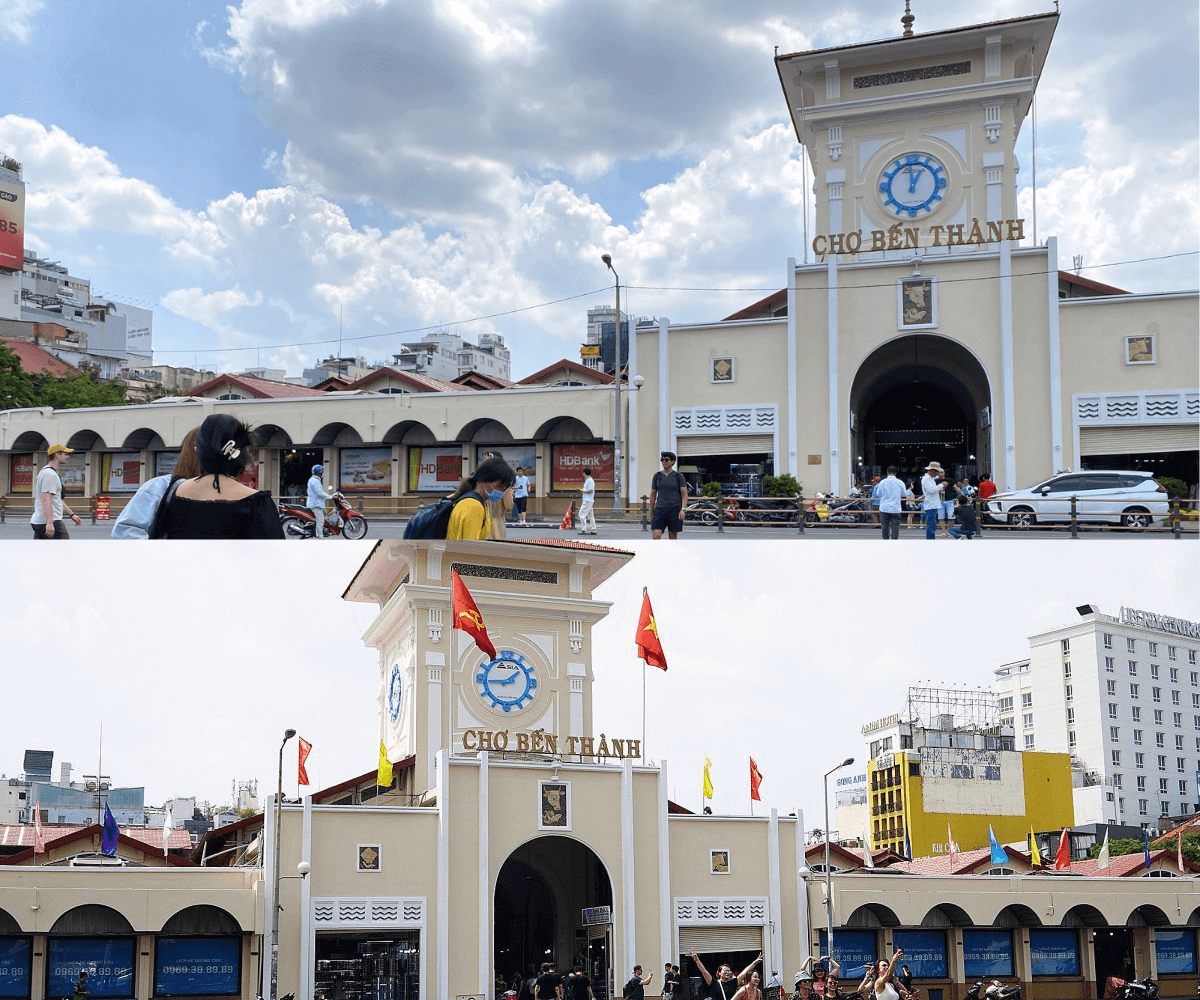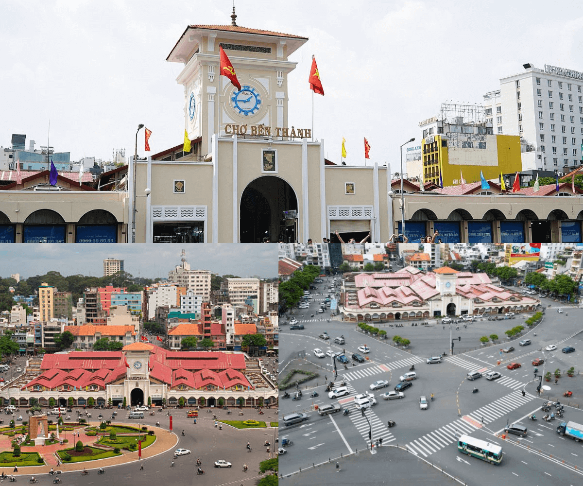 Bến Thành market nằm ở trung tâm quận 1, khu vực đông đúc và hoa lệ bậc nhất Sài Thành. Nằm gần nhiều điểm du lịch Sài Gòn nổi tiếng như Dinh Độc Lập, Bưu điện thành phố, Nhà hát thành phố… và nhiều khách sạn 5 sao cao cấp nên chợ Bến Thành thu hút rất đông du khách ghé đến. Chợ Bến Thành hình thành giữa thế kỷ 19. Trải qua thăng trầm của lịch sử, khu chợ này từ lâu đã trở thành biểu tượng cho văn hóa mua bán sôi động của Sài Gòn nói riêng và Việt Nam nói chung. Cùng với sự phát triển kinh tế, du lịch của Thành phố Hồ Chí Minh, khu chợ này cũng ngày càng nổi tiếng và đặc biệt thu hút đông đảo khách du lịch nước ngoài ghé đến tham quan. Người Việt Nam không xa lạ với những khu chợ đông đúc, nhộn nhịp. Nhưng với người nước ngoài thì đây lại là một nét văn hóa rất riêng. Vì vậy, khách du lịch ngoại quốc rất thích đến chợ mua sắm những món quà lưu niệm, thử món ăn đặc sản Việt Nam. Dần dần, Bến Thành trở thành biểu tượng nổi bật của Sài thành, khiến ai đến thành phố này cũng muốn một lần ghé qua. Chợ Bến Thành ban đầu được xây dựng vào thế kỷ 17 gần sông Bến Nghé để chào đón du khách và binh lính vào Thành Gia Định. Đó cũng là lý do vì sao chợ được đặt tên là Bến Thành (bến sông + thành trì). Chợ được làm bằng vật liệu gạch, gỗ và mái tranh. Chợ Bến Thành xưa rất đông đúc, nhộn nhịp, hàng hóa ghe xuồng tấp nập ngày đêm. Sau thời gian dài sử dụng, chợ dần xuống cấp, có nguy cơ sụp đổ bất cứ lúc nào. Vì vậy nên người Pháp đã cho xây dựng lại và mở rộng quy mô hơn sau khi lấp một ao sình mang tên Bồ Rệt. Từ năm 1912, phải mất thêm 2 năm, nhà thầu thi công Brossard et Maupin của Pháp mới hoàn thành công trình này. Các kiến trúc cũ từ đó vẫn được bảo toàn cho đến ngày nay dù chợ Bến Thành đã trải qua một cuộc cải tạo và sửa chữa lớn vào năm 1985. Chợ Bến Thành có 4 cổng chính và 12 cổng phụ. Mỗi cổng chính nằm trên một con phố khác nhau và trưng bày nhiều mặt hàng thông dụng để du khách mua sắm: Cửa Nam chợ Bến Thành: Cửa Nam nằm trên đường Lê Lợi, đối diện với công viên Quách Thị Trang, đây là cổng chính của chợ. Điểm nhấn của cổng chợ này là tháp đồng hồ 3 mặt nổi tiếng. Lối vào thu hút nhiều khách tham quan với những gian hàng bán đủ các loại hàng hóa, chủ yếu là vải vóc, thực phẩm khô. Cửa Đông chợ Bến Thành: Cửa Đông nằm trên đường Phan Bội Châu, là thiên đường cho những người đam mê mỹ phẩm. Các gian hàng tại đây bán đa dạng các sản phẩm chăm sóc cơ thể, da và tóc. Cửa Tây chợ Bến Thành: Cửa Tây nằm trên đường Phan Chu Trinh, cổng này có nhiều sạp bán giày dép, đồ thủ công và đồ lưu niệm. Cửa Bắc chợ Bến Thành: Cửa Bắc nằm trên đường Lê Thánh Tông, cổng này bán nhiều loại hoa tươi và trái cây nhiệt đới. Vào ban ngày, chợ Bến Thành nhộn nhịp với các gian hàng cung cấp nhiều loại hàng hóa, bao gồm hàng dệt may, đồ lưu niệm, thủ công mỹ nghệ, sản phẩm tươi sống, hải sản, gia vị... Không khí tại đây mang đúng chất một khu chợ châu Á điển hình, rộn ràng và dân dã. Chợ Bến Thành về đêm thì vẫn đông đúc nhưng lại có phần yên bình hơn. Các quầy hàng chủ yếu bán đồ ăn với các loại thức ăn nhẹ và đồ uống địa phương. Ngoài ra vẫn có một số cửa hàng bán quần áo, phụ kiện và đồ lưu niệm. Đèn đuốc sáng rực, hương thơm ngào ngạt của vô vàn món đặc sản Việt Nam là điều níu chân du khách.