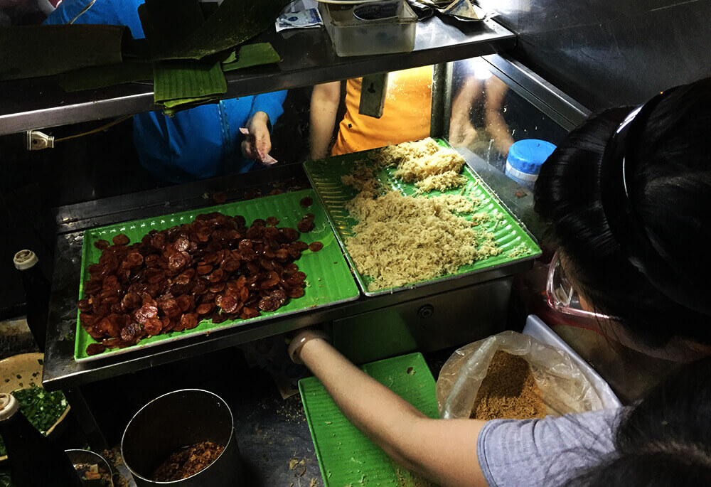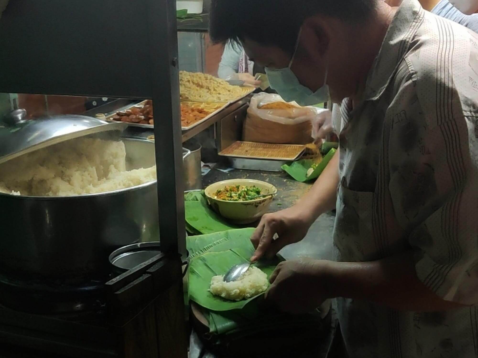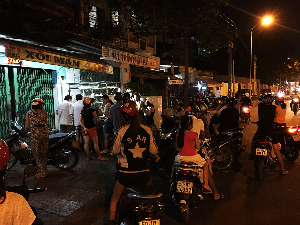 Quán xôi bán từ 3 giờ chiều đến đêm khuya,nhưng đông khách nhất là từ khoảng 19-20 giờ. Có đến ba người gói xôi nhưng dường như vẫn không kịp phục vụ lượng khách đông đảo. Người thì múc phần xôi còn nghi ngút khói,người trải xôi lên lá chuối,múc nguyên liệu,người gói lại rồi mang ra cho khách.