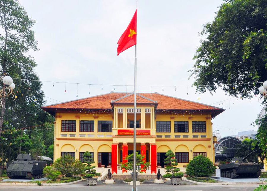 Tòa nhà đầu tiên bạn thấy khi bước qua cổng chính là Nhà trưng bày Truyền thống Lịch sử Cách mạng. Nơi đây có diện tích tổng cộng 844m2,bao gồm một tầng trệt và một tầng lầu. Tòa nhà này có một lịch sử đặc biệt,vì trước đây nó vốn là Dinh tỉnh Trưởng từ thời Pháp. Giờ đây,nó được sử dụng để trưng bày về lịch sử đấu tranh kiên cường của tỉnh nhà.