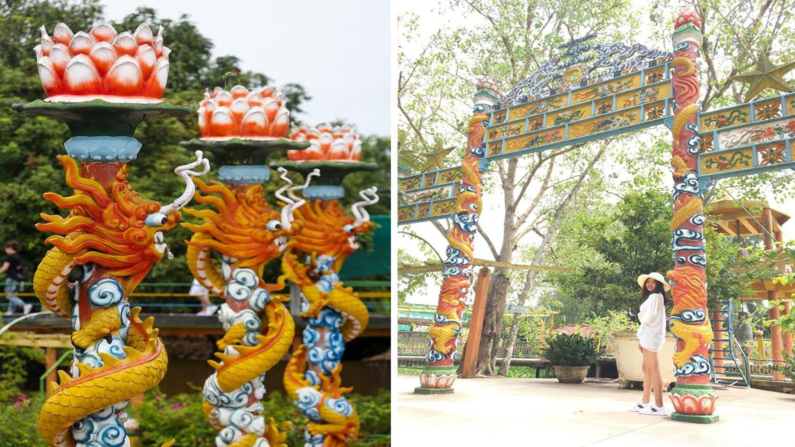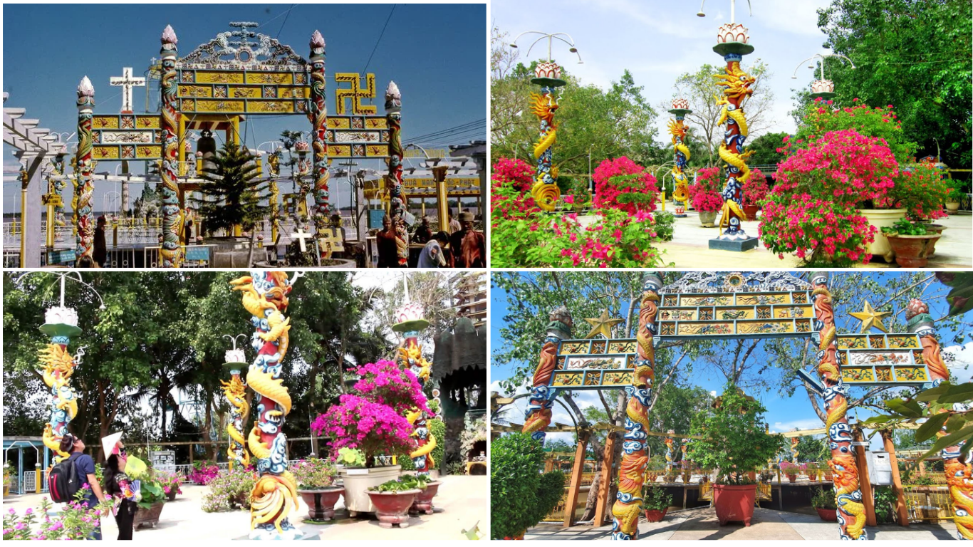 Dạo một vòng quanh khu di tích tại phường Phú Tân,mình thật sự choáng ngợp trước các công trình kiến trúc độc đáo. Nổi bật nhất là "Sân 9 Rồng" với các cột trụ được chạm khắc hình rồng uốn lượn tinh xảo,tượng trưng cho chín nhánh sông Cửu Long. Đây là nơi các tín đồ tập trung hành lễ và nghe giáo chủ thuyết giảng đạo lý. Bên cạnh đó,Tháp Cửu Trùng Đài vươn cao,là nơi ông Nam ngồi thiền và chiêm nghiệm sự đời.